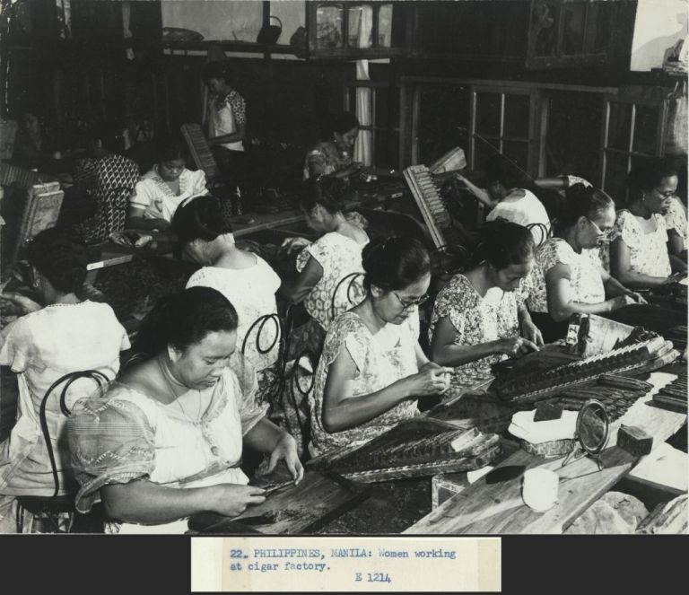 Filipino women sit at tables rolling tobacco leaves into cigars.