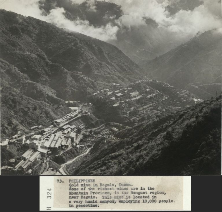 Gold mining operation, likely Benguet Consolidated Mining Inc., stretches along a river valley in mountainous country of Benguet Province. Benguet Consolidated expanded in the 1927 when it bought gold mines in Balatoc and Acupan, both in the Benguet province.