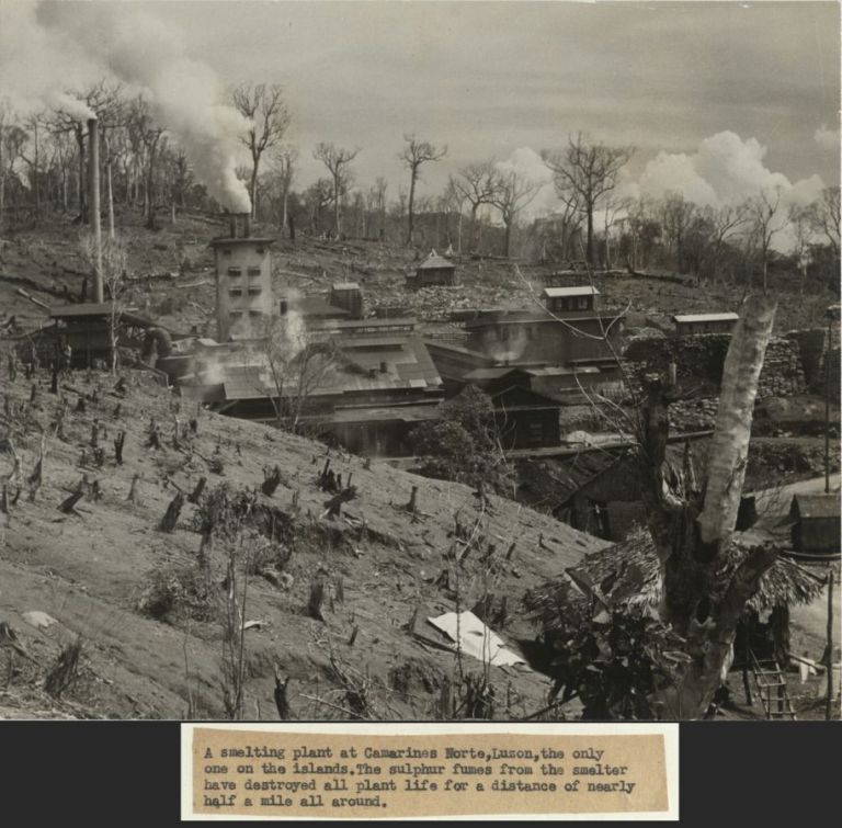 The ugly side of mining operations in Luzon. Full caption continues: "The sulphur fumes from the smelter have destroyed all plant life for a distance of nearly half a mile all around."