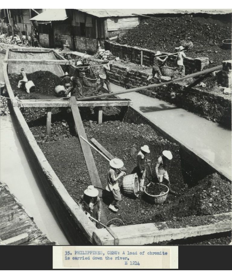 35. PHILIPPINES, Cebu: A load of chromite [coal?] is carried down the river. E 1214.